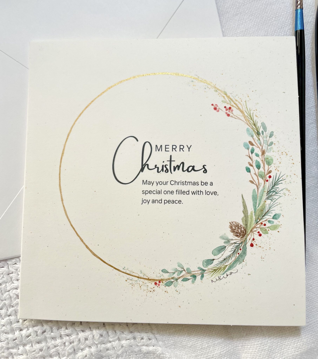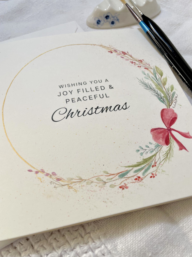 Original Watercolour Christmas Cards painted on square card stock, featuring golds, reds and Christmas foliage with a festive red ribbon or pine cone and heartfelt sentiment. Comes with matching envelope. Blank inside.